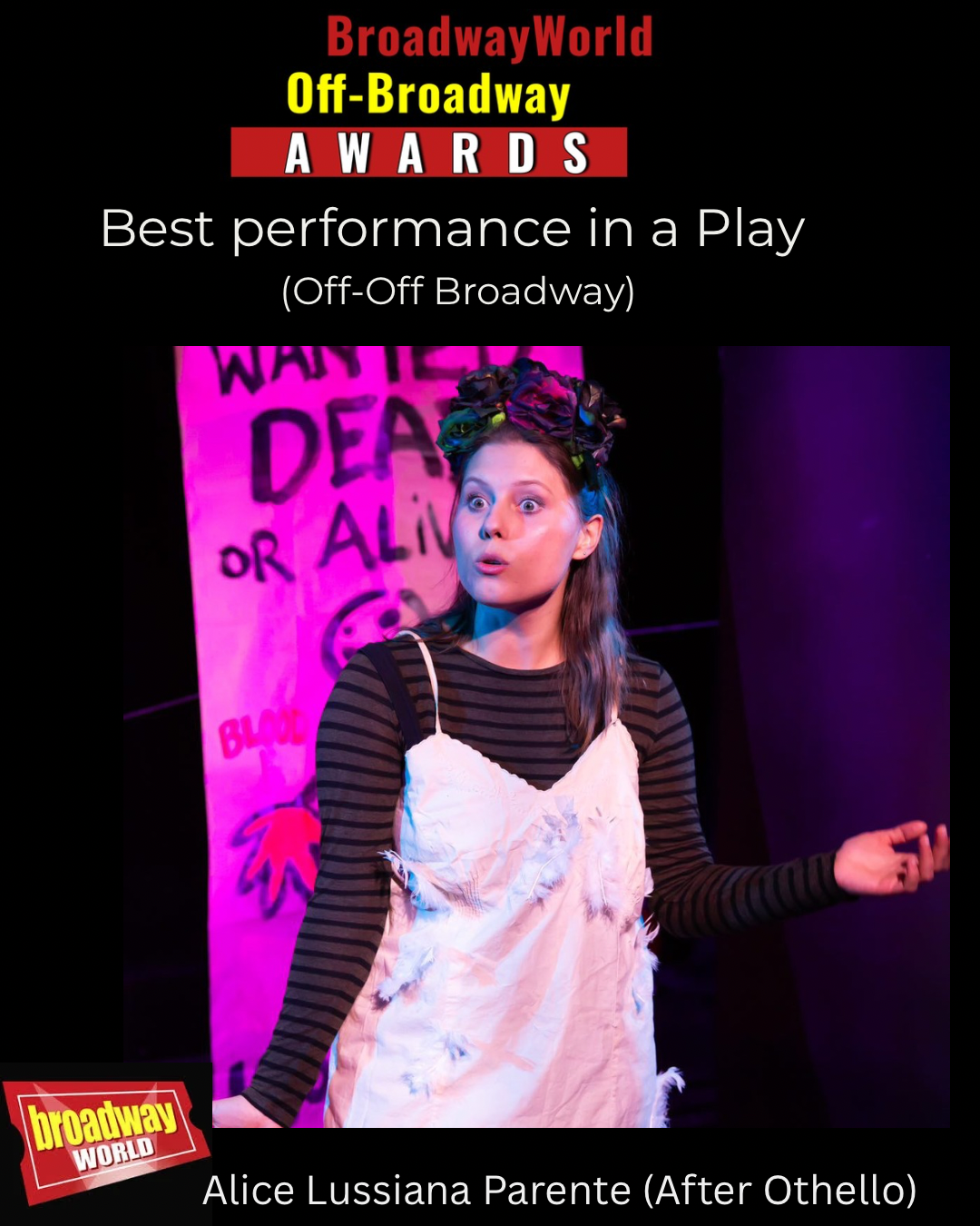 Alice got nominated at the Broadway World awards - Best Performance in a play (off-off Broadway)
